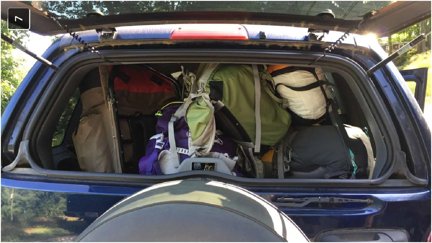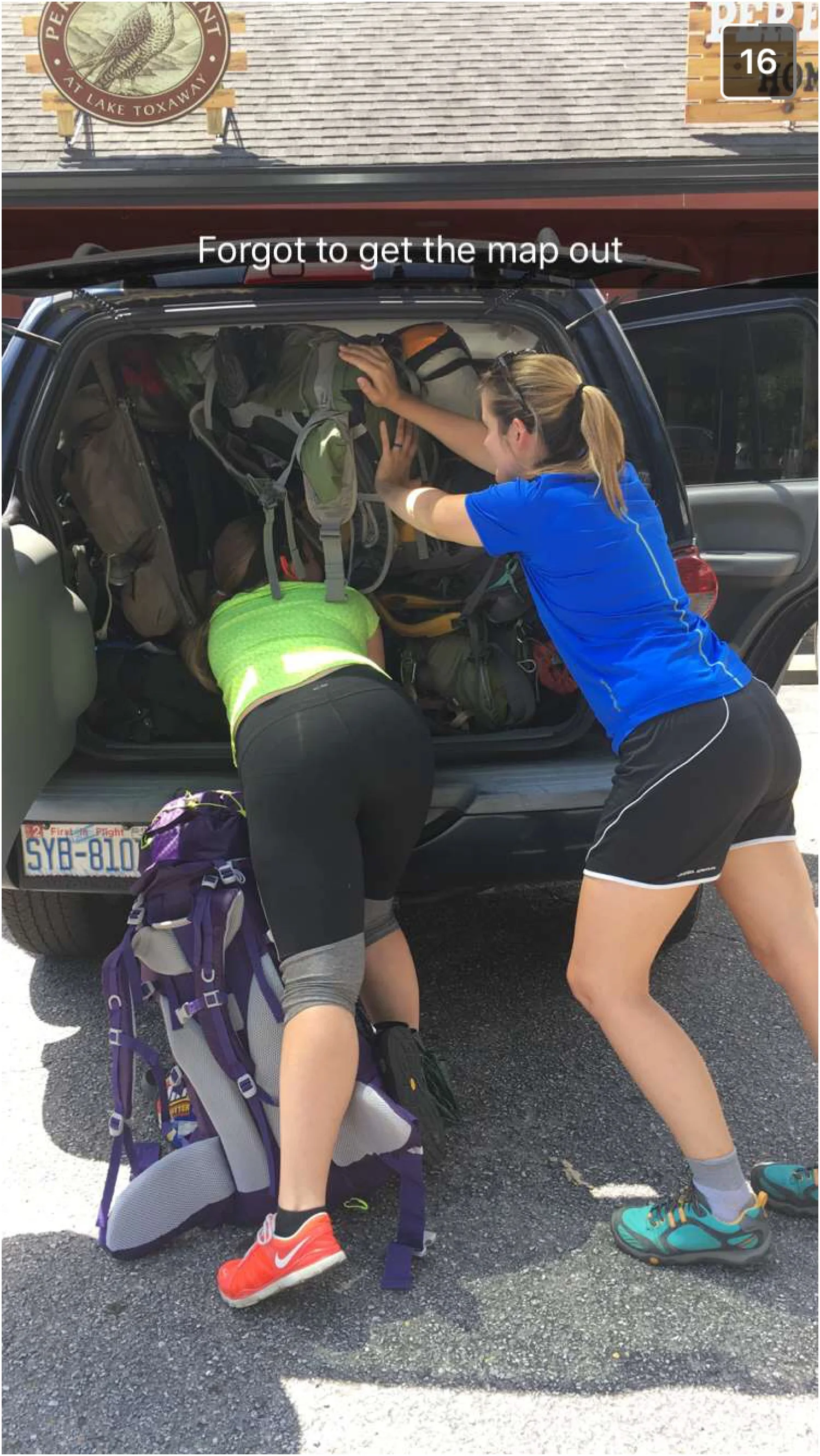 Lesson #1: Always have a map and remember to not pack it in your backpack/keep it with you on the drive there. Tonya has an awesome map of Panthertown, but we always forget to get it out of her pack! Our adventure started when we got lost around Lake Toxaway (we think) and had to pull over to find the map. Here are some snapchat screenshots from Elizabeth of Tonya's packed Jeep...